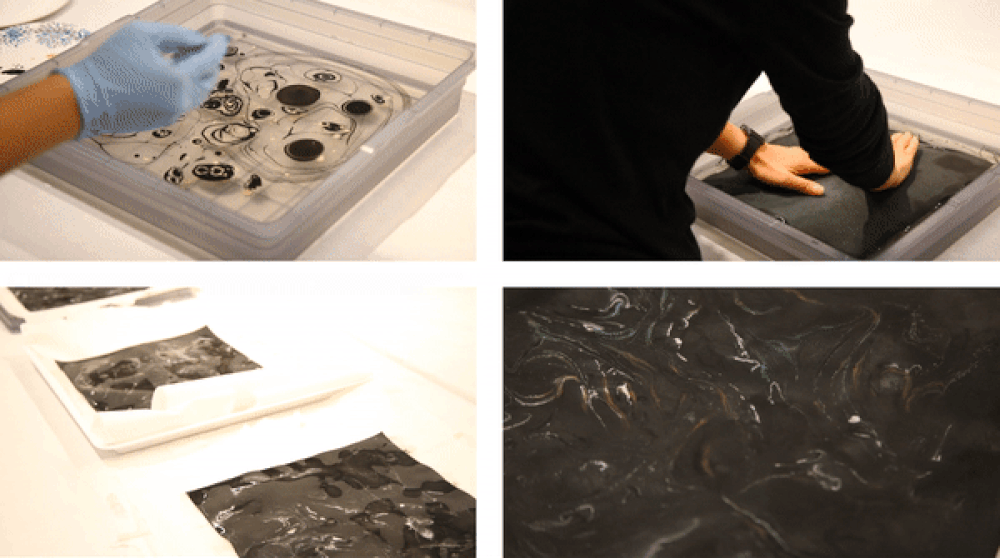 After doing a quick Youtube search, I went down a rabbit hole of marbling tutorials, including suminagashi, the Japanese art of paper marbling. I learned that it is possible to marble textile surfaces, so I decided it would be interesting to try with leather.