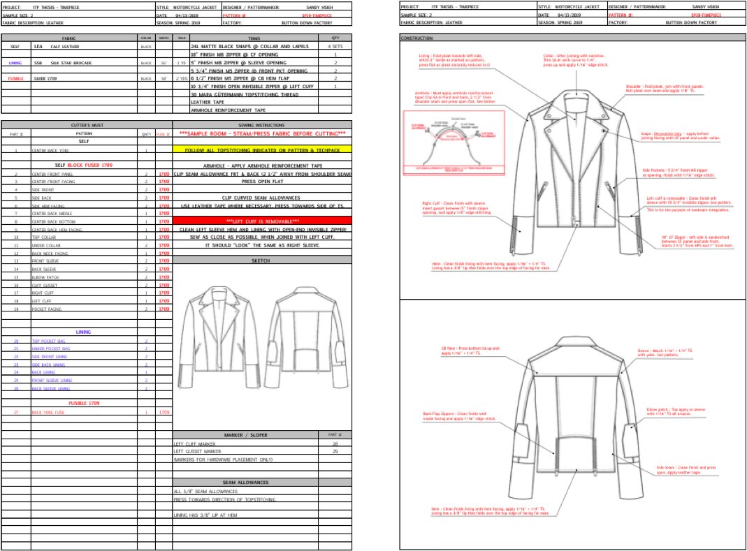 To demonstrate and test the viability of modular patternmaking, I designed a case study where I conducted qualitative interviews with 35 people about their style and how they envision the future of wearables. A thorough analysis and aggregation of common themes and insights led to the ideation of Timepiece, a leather biker jacket that explores gesture as a wearables solution. Materials and a detailed techpack was sent to a factory in Midtown, New York City with two-weeks lead time for production to learn about communications and challenges that may arise in manufacturing. Timepiece was assembled in just 8 days.